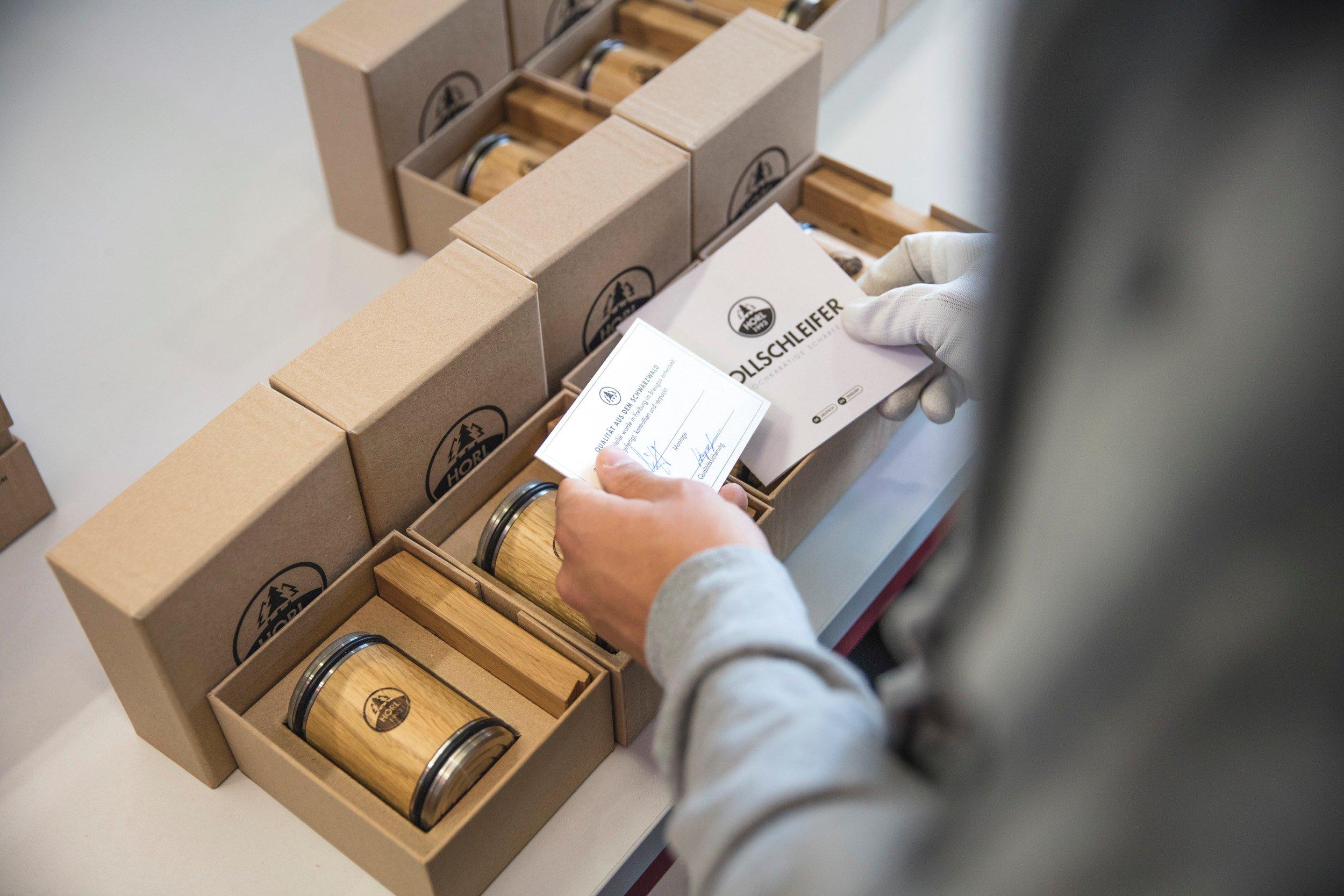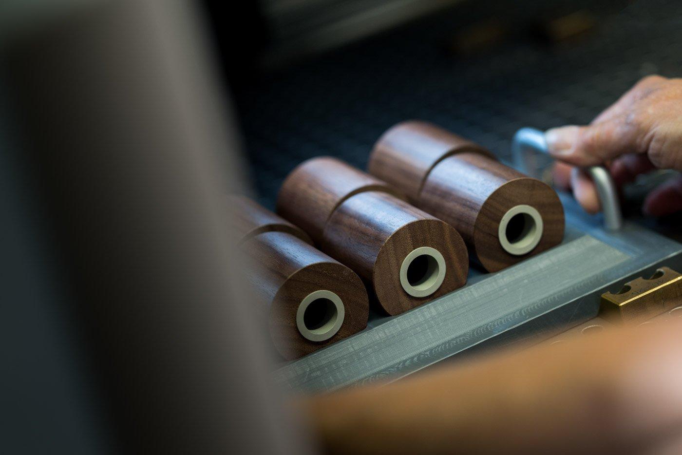 Une fois arrivé à destination, les éléments en bois sont encore une fois mesurés. La prochaine étape est de graver le bois à l'aide d'un laser. Les aiguiseurs sont alors dotés de leur noyau fer (de roulements à billes pour le HORL 2) et de disques en céramique ou acier inoxydable au revêtement diamanté. Les aimants sont placés à l'intérieur de la base magnétique et fixés à l'aide de la pression et de la quantité de glue parfaites. Après un dernier contrôle, les aiguiseurs sont prêts à quitter la fabrique, et en route vers leur prochaine destination : Knivesandtools !