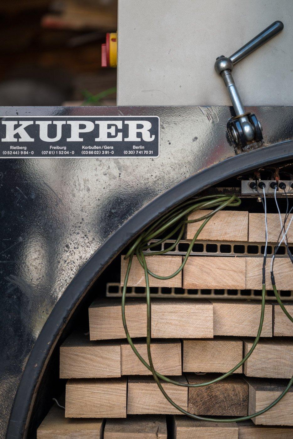 En ce moment, HORL utilise deux types de bois différents : le chêne américain et le noyer foncé. Dès l'arrivée du bois, les experts chez HORL le font sécher à une température de 80°C, ce qui va réduire l'humidité du bois de 12% à 7%. Pour ce faire, ils se servent d'une étuve de séchage à vide d'un mètre de long. Cette étape prend environ une semaine. Mais c'est essentiel pour s'assurer que le bois reste stable et ne rétrécira pas pendant le reste du processus de fabrication. Dès que le bois est bien sec, il est alors coupé en vue de la prochaine étape.