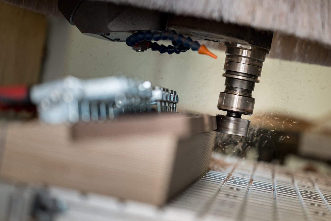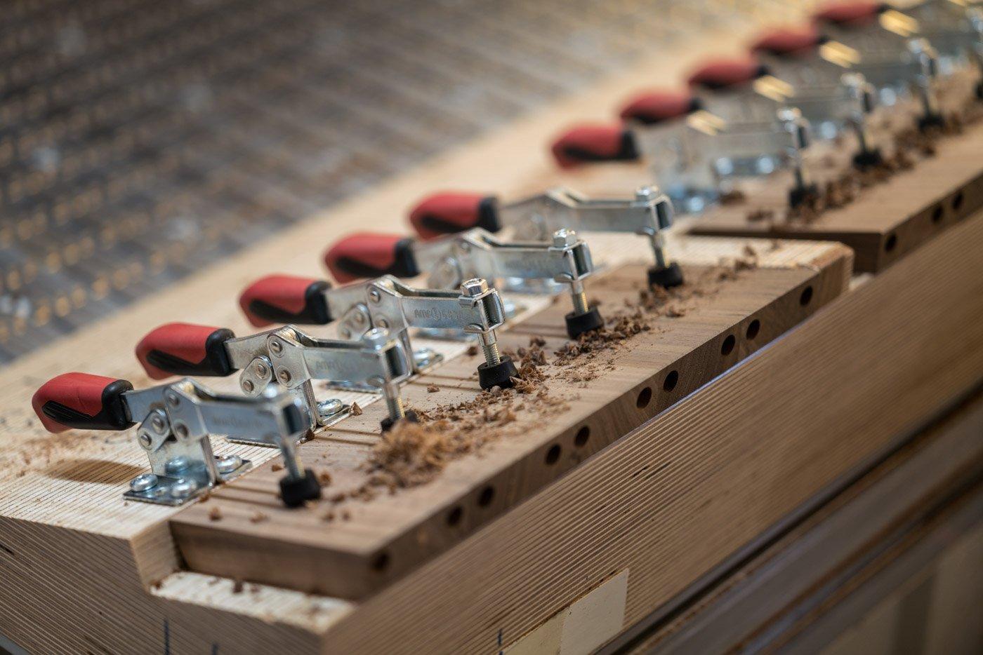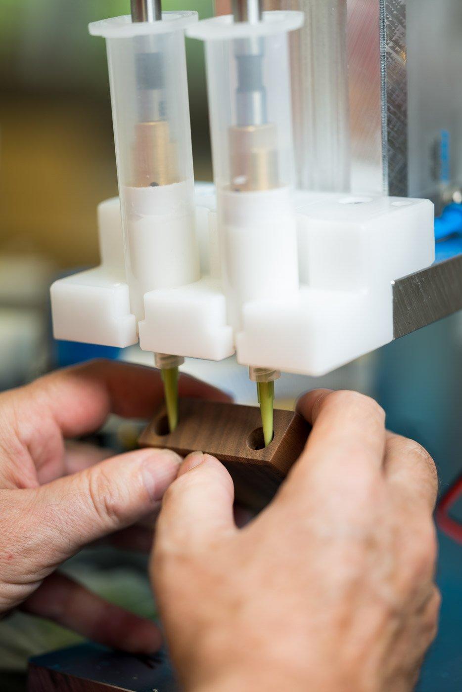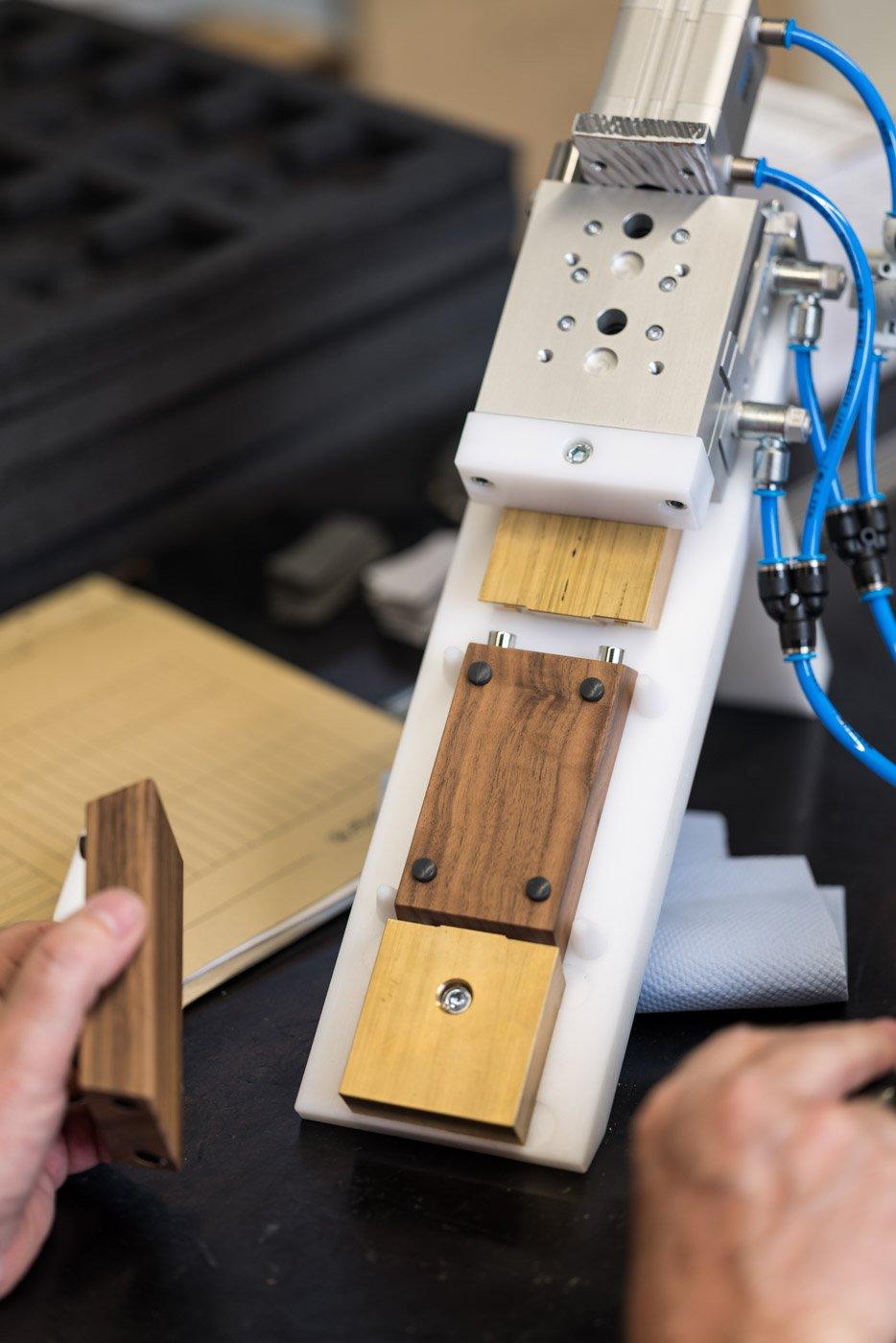 Les morceaux de bois sec sont placés dans différentes fraiseuses. Ces machines permettent de rapidement transformer les morceaux de bois en ces fameux supports pour pierres à aiguiser HORL Station, boîtiers HORL Displays, et bien sûr, les aiguiseurs de couteaux HORL. La machine rectifie chacun des angles et perce des trous qui seront utiles pour plus tard. Les supports magnétiques inclus dans chaque aiguiseur de couteaux HORL sont fixés sur un morceau de bois biseauté à un angle de 15 ou 20 degrés. Une fois que la machine a terminé, chaque morceau de bois comportera un angle de 15 degré sur un côté et de 20 degré sur l'autre. Ainsi, votre couteau bénéficiera du même angle lorsque vous l'aiguisez. Les lecteurs attentionnés l'auront peut-être déjà remarqué. Les angles et lignes des HORL Station et HORL Display sont également fraisés à un angle de 15 degrés. Même si ce n'est pas d'une grande importance pour l'aspect fonctionnel, ça donne un ensemble harmonieux et très beau.