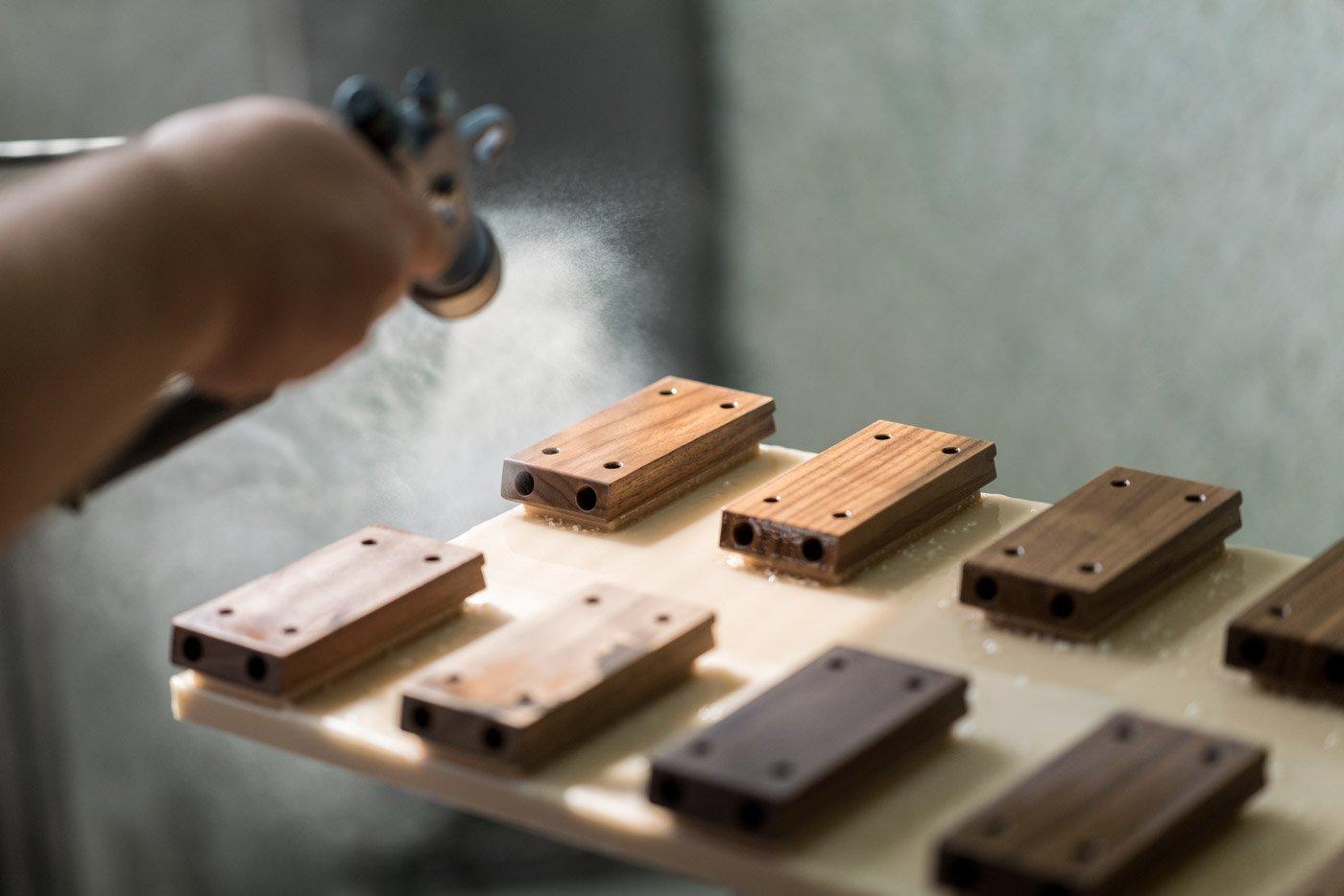 Après ce traitement aux petits soins, les éléments en bois viennent recevoir une fine couche de vernis. Ce revêtement protège l'aiguiseur de l'humidité et de la saleté, et leur donne en plus cette finition brillante. À la place de cette jolie couche de vernis, on passe sur les HORL 2 Cruise et HORL 2 Pro une (encore plus) belle couche de peinture. Ensuite, tous les éléments sont transportés vers le prochain bâtiment pour l'assemblage final.