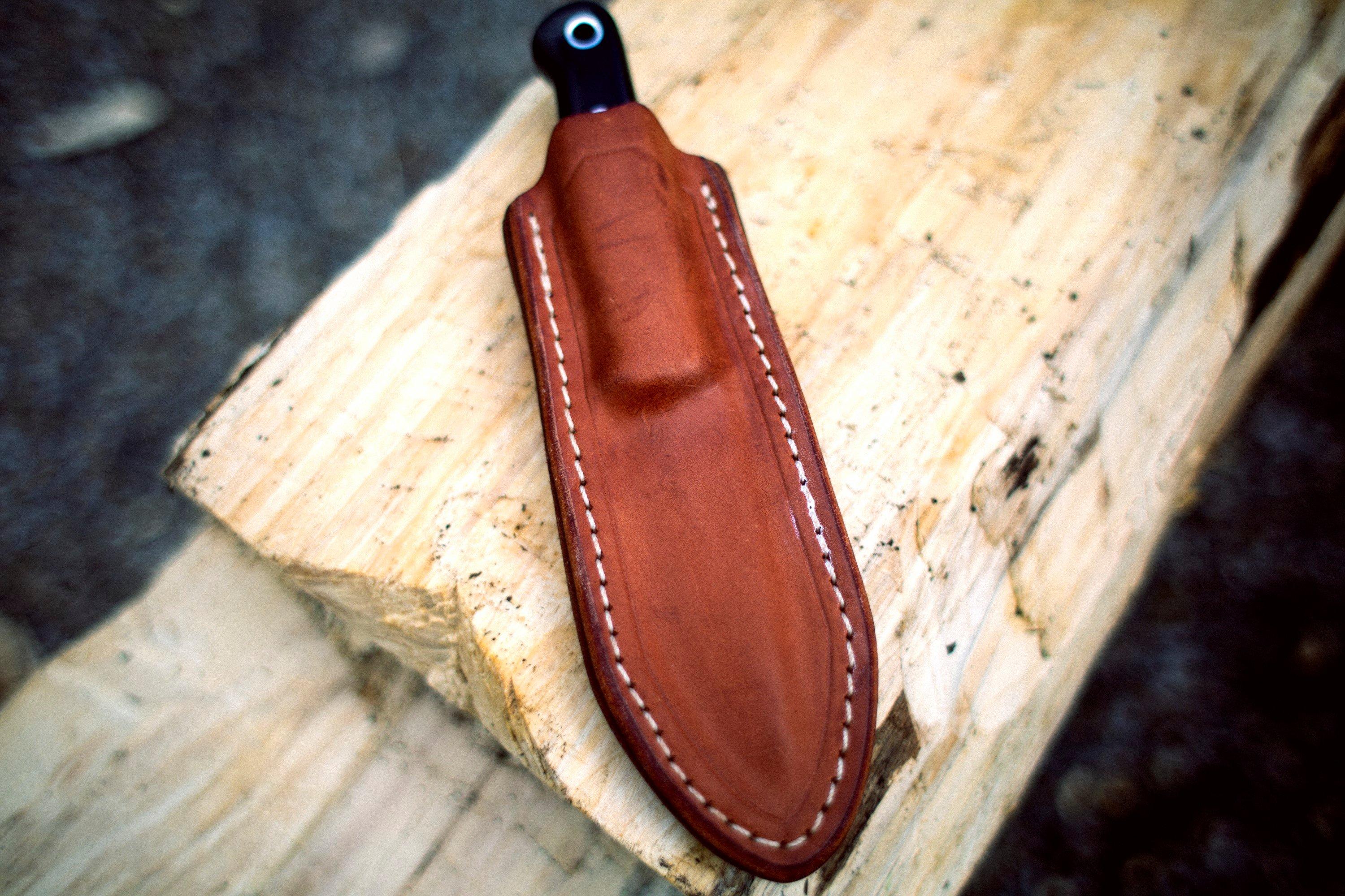 Pour être honnête, l’étui ne m’a pas immédiatement séduit. Lorsque j’ai voulu placer le couteau dans l’étui, cela m’a demandé beaucoup d’effort. Tellement que je me suis demandé si je n’avais pas reçu le mauvais étui. L’étui est cependant conçu de manière à ce que, avec le temps, le cuir se moule autour des formes du couteau. Mais cela peut prendre un certain temps. Pour accélérer le processus, j’ai mouillé l’étui à l’eau tiède, y ait placé le couteau puis pressé le cuir jusqu’à ce qu’il embrasse parfaitement les formes du couteau. Si vous n’avez jamais effectué de moulage de cuir auparavant, ce couteau est parfait pour expérimenter. Conseil : enveloppez la lame dans du film plastique avant de l’insérer dans l’étui mouillé. Elle risquerait de rapidement rouiller.
