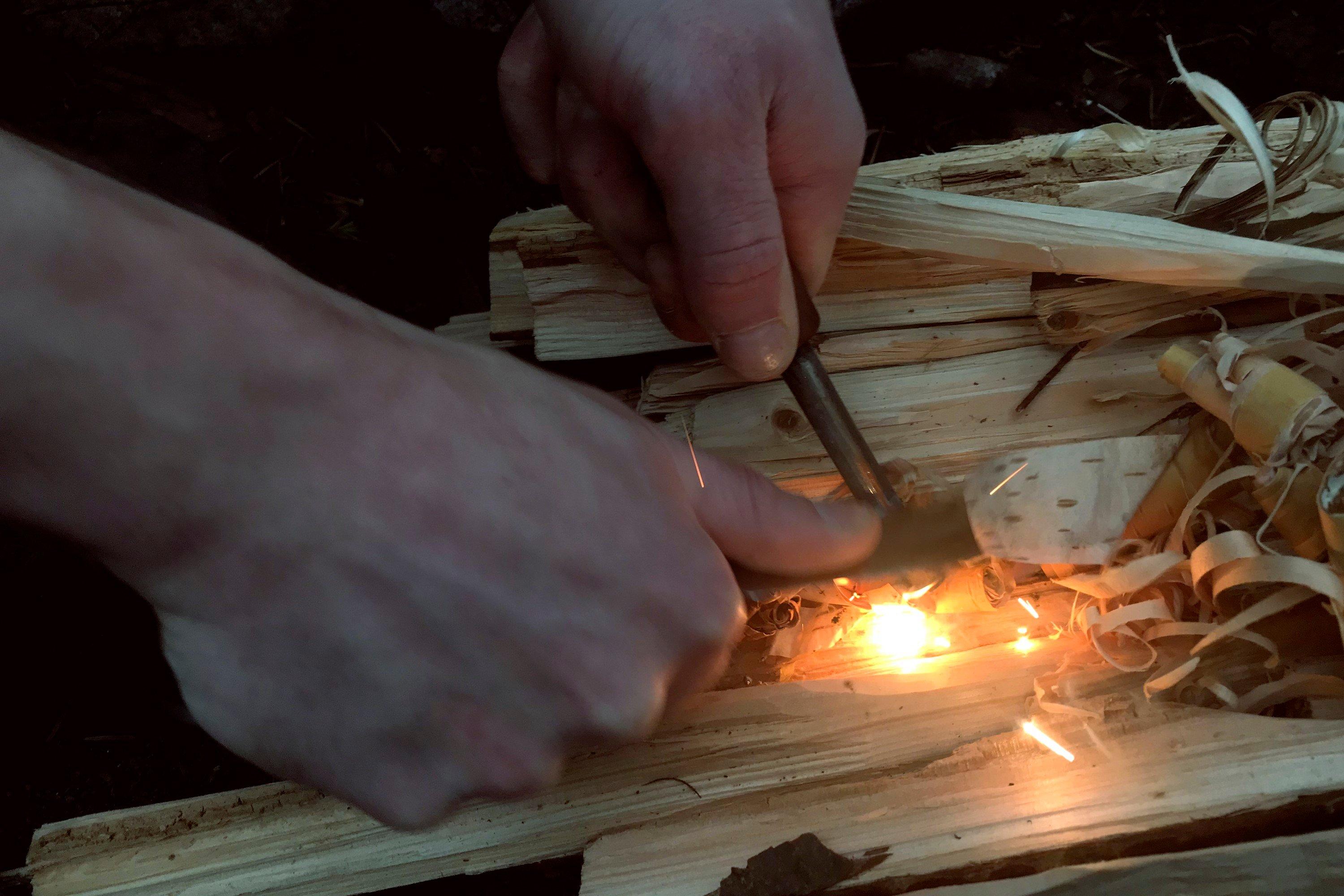 Comme certains d’entre vous ont pu le voir sur ma revue d’expert du KA-BAR BK2, j’aime aussi allumer un feu à l’archet. Il me faut donc créer tout ce qu’il faut. Cela permet de s’essayer à des tâches plus difficiles. Comme bâtonner une bûche de 10 cm d’épaisseur par exemple. Celle-ci me procurera tout ce dont j’ai besoin pour allumer un feu par friction. Que ce soit le foret ou la planche à feu. Le couteau doit également être capable de faire un creux rond permettant de placer le foret dans la planche ainsi qu’une encoche en forme de V sur le côté.
